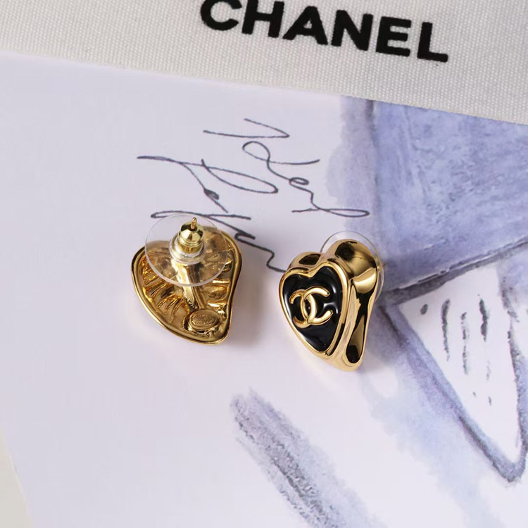 Chanel black enamel love double C gold edge earrings-3739