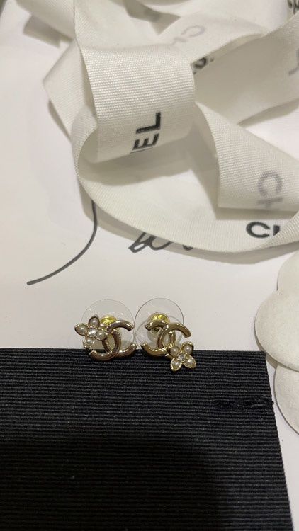 Celine pearl rhinestone small flower gold double C earrings-3898