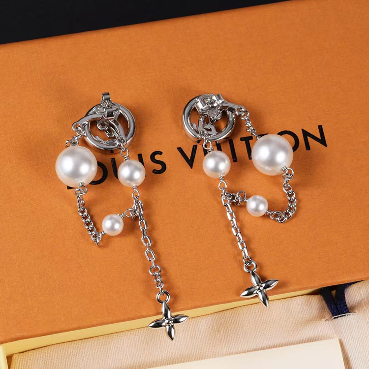 Louis Vuitton LV silver letter diamond pearl tassel earrings-3865